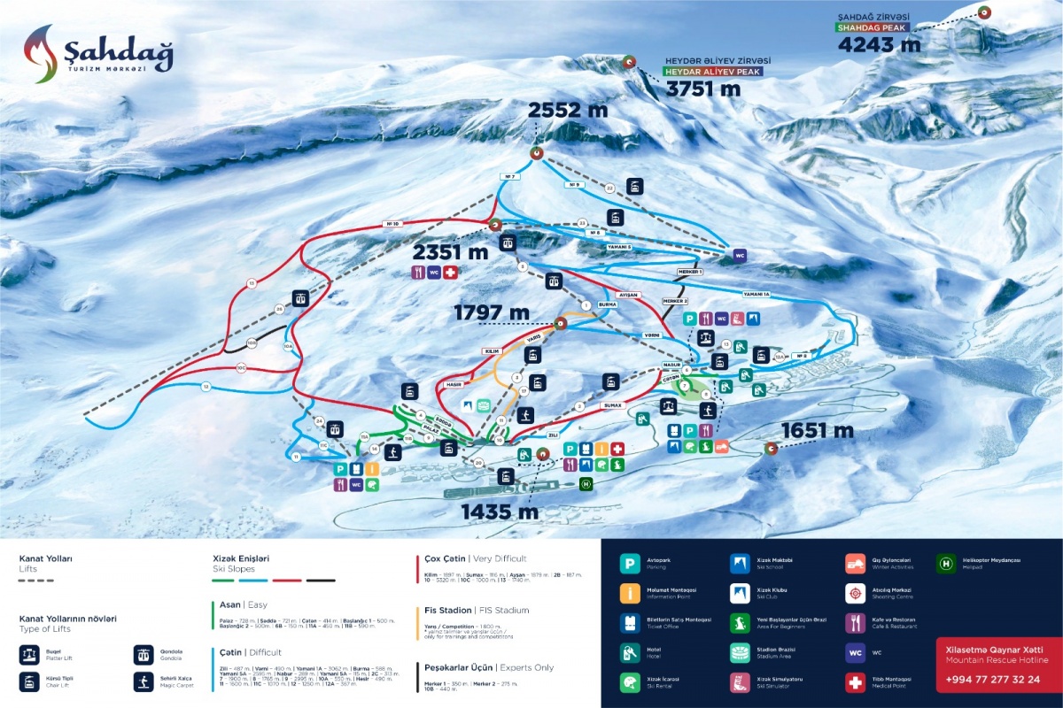 - В первую очередь надо отметить, что курорт «Шахдаг» находится всего в двух с половиной часах езды от Баку, поэтому добраться сюда совсем не сложно. Комплекс может похвастаться 32 километрами лыжной трассы разных уровней сложности, соответственно любой турист может найти здесь что-то подходящее именно для него. В «Шахдаге» 12 канатных дорог, самая высокая точка на сегодняшний день – это 2552 метра, самая нижняя - 1435 метров. Самая длинная лыжная трасса - 8200 метров, а самая сложная предусмотрена для профессионалов и ее протяженность 6500 метров. Вертикальное падение, то есть перепад высот на «Шахдаге», составляет больше 1100 метров. Замечу, что для хороших горнолыжных курортов это достаточно высокие показатели. Кроме этого, мы построили новую трассу протяженностью 1800 метров, и она сможет принимать международные соревнования самого высокого уровня. Трасса будет запущена в начале 2024 года для пользования лыжников, а также проведения местных соревнований. В международный календарь первенств по лыжным видам спорта мы планируем попасть уже с 2025 года. Но хочу рассказать, что в марте 2024 года «Шахдаг» впервые будет принимать соревнования международной серии по лыжному альпинизму Международной федерации лыжного альпинизма.